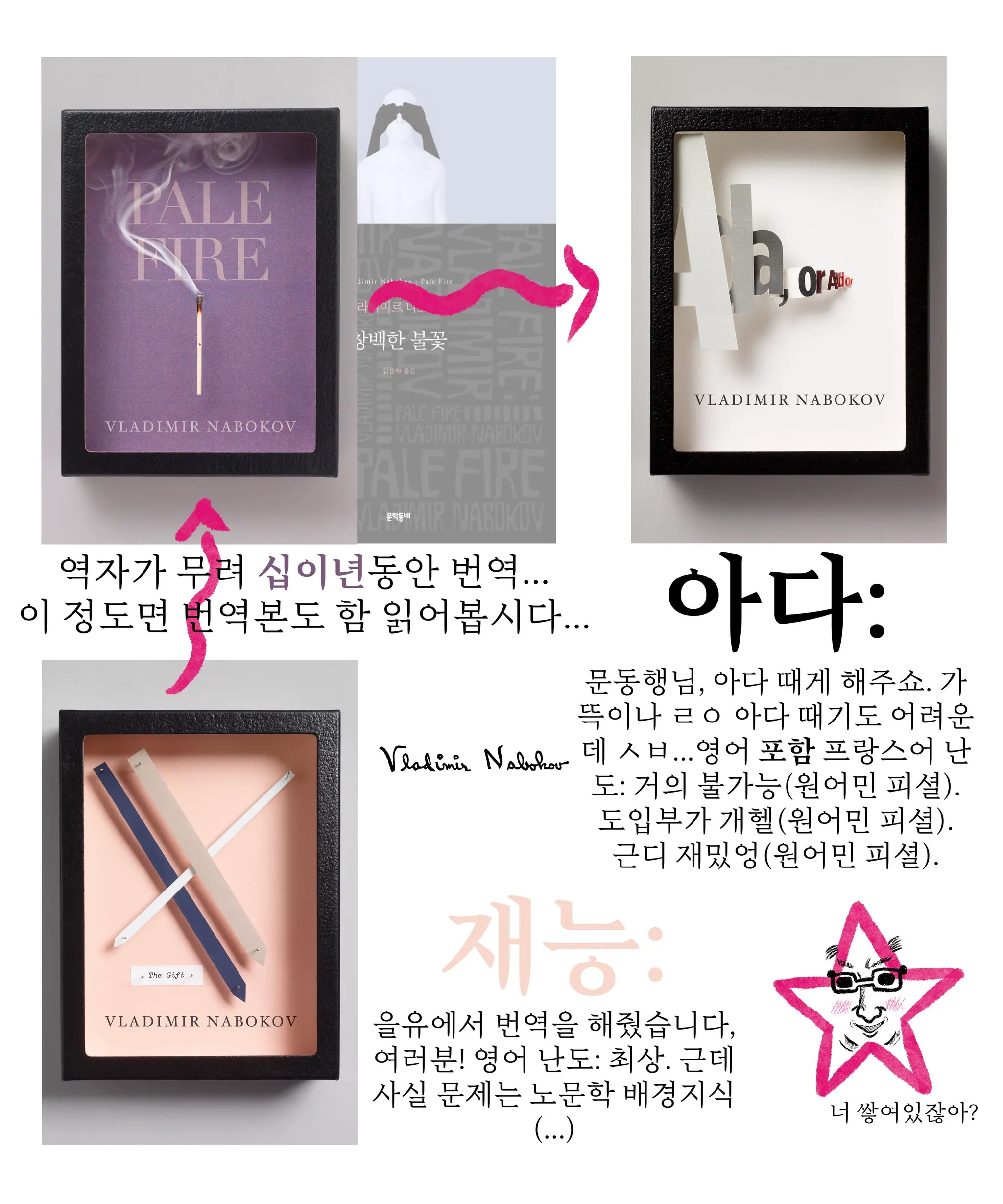 17. 창백한 불꽃: 존 셰이드의 ㅇ, 찰스 킨보트의 ㅇㅇ; 나보코프는 대담한 구조의 걸작을 만들어냈다(ㅇ과 ㅇㅇ은 스포일러이므로 구멍으로 남겨두었다. 읽어본 사람은 안다). 영어 난도: 최상