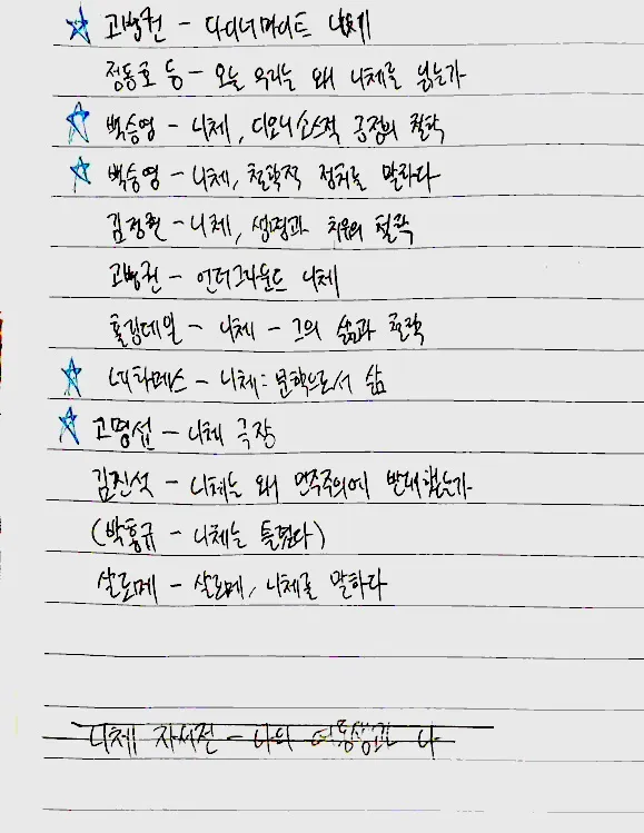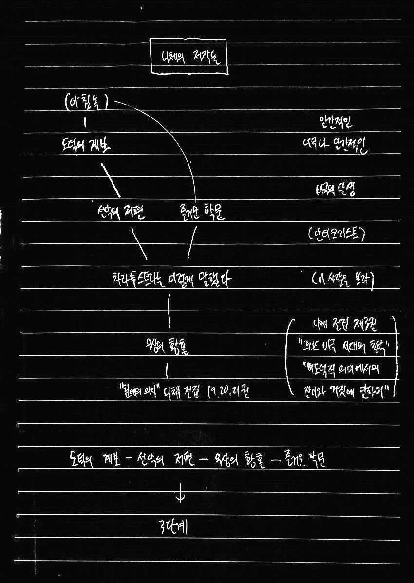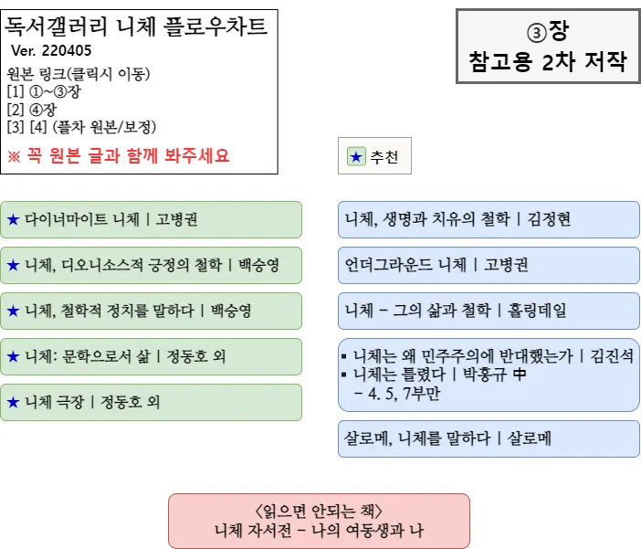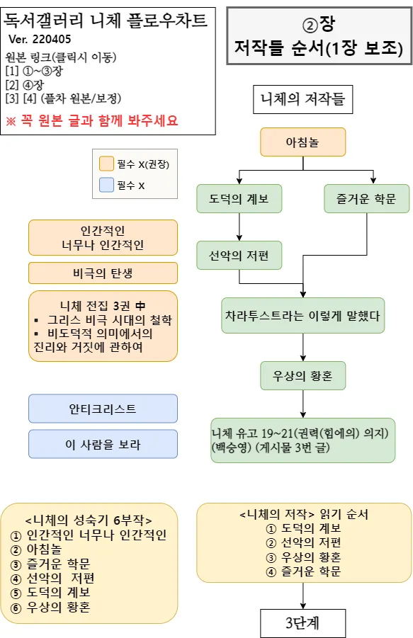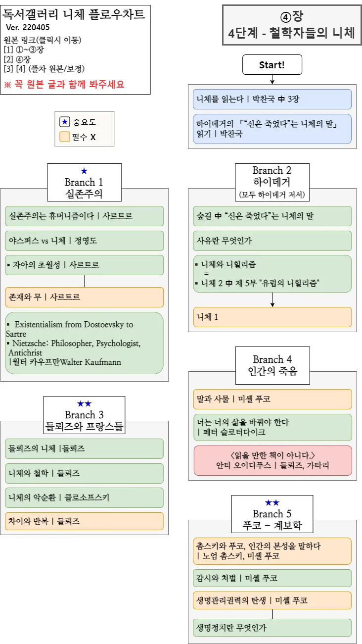 기존 플로우 차트와 전혀 다른 방식이지만, 니체를 따라 기존 플로우 차트를 한 번 '전도'시켜 본 거라고 생각해주시면 좋겠음.. 참고로 이 플로우 차트는 어느 정도 니체에 대해 알고 있는 사람이 교양서적이 아니라 '니체가 쓴 책'을 직접 읽고 싶을 때 유용할 것이라고 개인적으로 생각하고 있음. 처음 읽으시는 분들은 기존 플로우 차트가 더 유용할 거임.